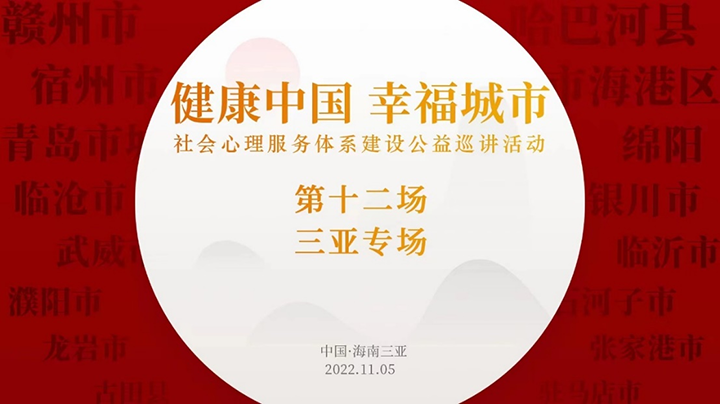 11月5日上午9时,“健康中国~幸福城市”全国社会心理服务体系建设公益巡讲活动第12场将在美丽三亚倾情展开。三亚专场活动由三亚市卫健委主办,市社会心理服务技术指导中心和市心理学会承办。