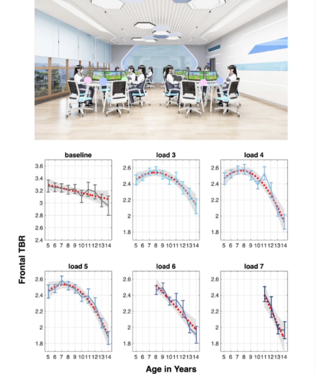 注意控制,即关注任务相关信息同时屏蔽不相关信息的能力,是体现大脑发展成熟程度的关键指标。近期,清华大学心理学系张丹课题组与北京视友科技有限责任公司合作,依托5207名5-14岁儿童青少年在完成视空间工作记忆任务的大规模脑电样本,绘制了前额Theta-Beta Ratio(前额TBR)这一注意控制神经标志物的发展轨迹,从神经电生理的视角为注意控制的发展变化过程提供实证证据[6]。