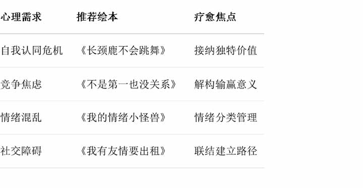 · 认同(Identification):当孩子看到《长颈鹿不会跳舞》中笨拙的杰拉德时,会自然联想到自己运动课上的挫折,产生“它和我一样”的联结感