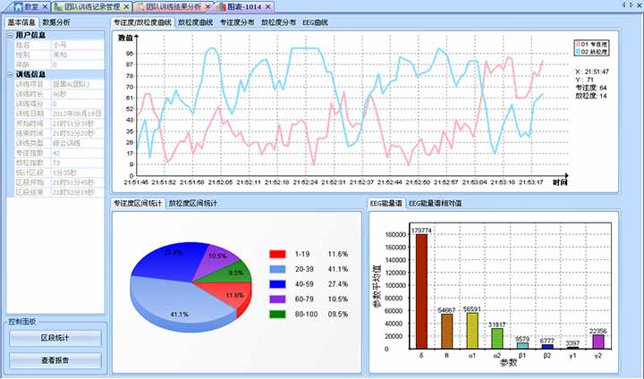 (1) 数据统计和分析:用曲线图、柱状图、饼图等图表形式显示分析结果,给予训练效果评价。通过对比训练前后的脑电数据和心理指标,评估职业人的专注力、放松度、情绪状态等方面的变化。