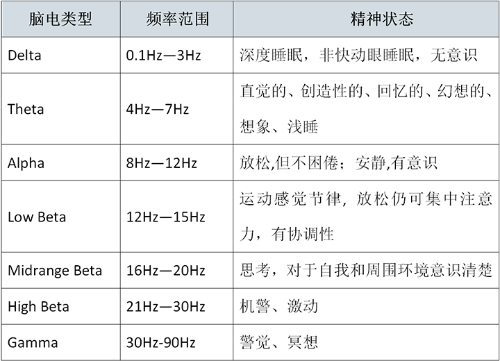 脑电是脑科学的基础理论研究,自上世纪以来,通过对脑电的研究,人们在很大程度地增加了对于大脑的认识。这是一些自发的有节律的神经电活动,其频率变动范围通常在0.1Hz-100Hz之间,根据其频率不同可划分为Delta波、Theta波、Alpha波、 Beta波、 Gamma波等多种类型。其节律与人的各项生理及心理活动有着密切的关系。