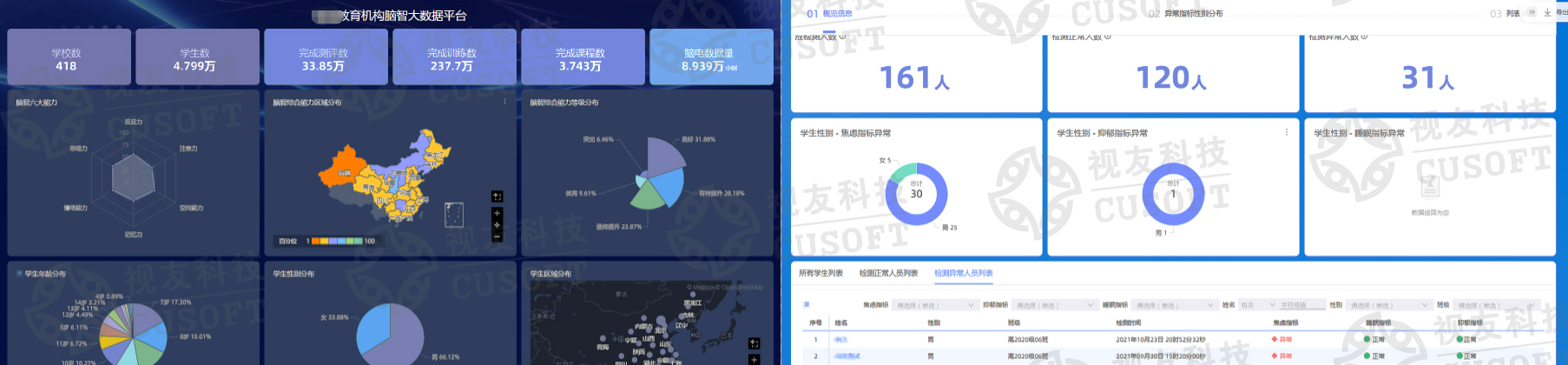 - (3)多维数据展示。通过可视化平台进行大数据图形化多维展示,展示内容包括各项统计信息、学生脑发育和认知能力发展趋势信息、预警提示信息、训练成果展示信息等,为各级教育和培训机构提供内部学习情况监督、问题分析识别与预警、教育策略优化和学习效果评价等。