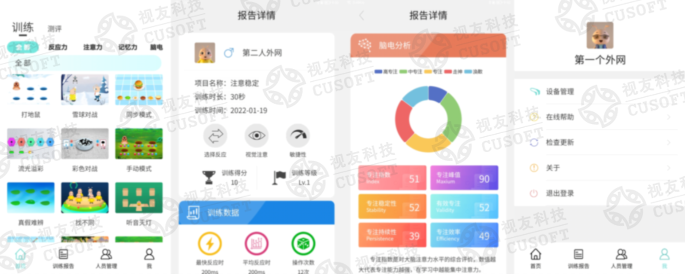 “脑力星”:用于心理重建团建的脑电及认知能力评估训练系统。脑力星采用专业测评硬件装置以无接触的方式实现脑电生物反馈,并结合脑机技术采集脑电数据,可以实现对反应力、注意力、空间能力、记忆力、情绪能力、思维力等多项认知能力评估、认知能力训练和同步脑电分析,并给出专业的分析报告。