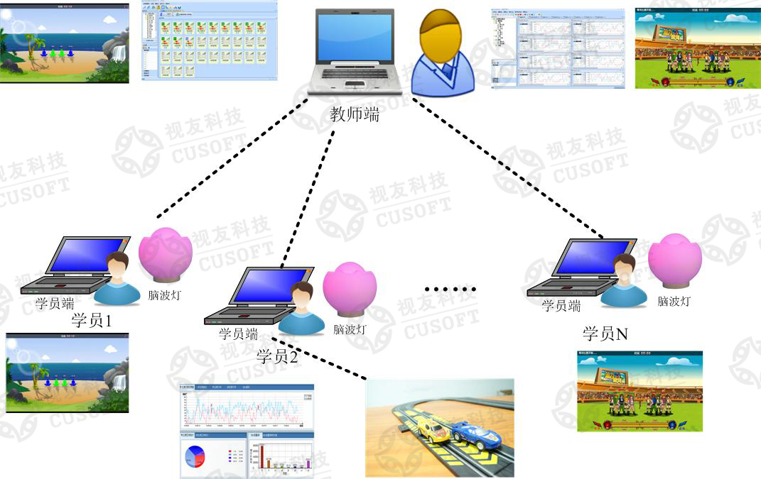 佰意通团体版系统包括教师端、学员端、管理端和CUBand脑波仪,提供教师指导学生训练的全套功能。可以为每个学员选配思语脑波灯。